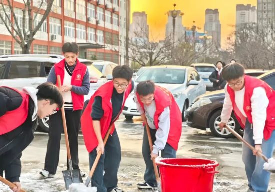 近日,强降雪天气席卷校园,漫天飞雪为校园披上了银装,却也给师生出行带来了诸多不便,路面结冰湿滑,存在较大的安全隐患。为保障校园道路畅通与师生出行安全,校团委于1月23日下午组织志愿者开展铲雪除冰志愿服务活动,志愿者们用双手筑牢校园安全防线,成为冬日里一道温暖而亮丽的风景线。活动中,同学们展现出不怕苦、不怕累、不畏严寒的奋斗精神。高年级同学主动承担起铲除坚冰的重任,奋力清理路面;低年级同学则细致清扫积雪,不放过任何一处通行隐患。大家团结协作、干劲十足,用热情与汗水融化冰雪,以实际行动诠释青春的责任与担当。此次志愿服务活动,不仅有效改善了校园道路环境,保障了师生安全出行,也进一步增强了同学们的集体荣誉感和奉献意识。在凛冽寒风中,志愿者们用热情温暖校园,以行动传递正能量,展现出我校学子团结互助、勇于奉献的良好风貌。